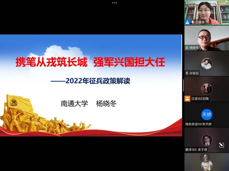 会上,校人武部杨晓冬老师以“携笔从戎筑长城 强军兴国担大任”为题,就入伍政策、征兵流程、优扶政策等方面详细解读了2022年征兵政策。他指出,大学生参加入伍对军队现代化建设发展,优化部队兵员文化结构,加快我军科技强军都有着十分重要的意义。参军报国是大学生应当履行的职责和义务,也是促进青年学生成长成才优质就业的重要举措。他希望同学们能够明晰征兵政策,了解入伍流程,参军入伍,携笔从军,以自己的实际行动报效国家,把成才梦融入强国梦、强军梦。