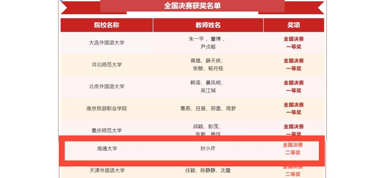 7月25日,2023“外研社杯” 全国高校日语课程思政教学设计大赛(日语专业组)评审结果公布,日漫 教师封小芹的参赛作品获得全国决赛二等奖。