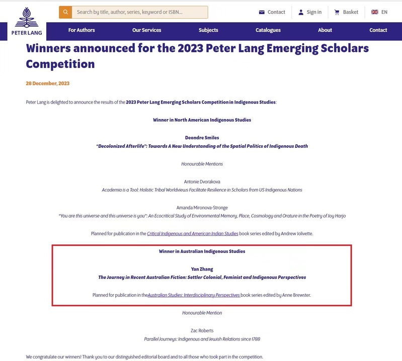 近日,兰培德国际学术出版集团(Peter Lang)“2023年度青年学者大赛”(2023 Peter Lang Emerging Scholars Competition)结果揭晓,我校日漫 张艳博士的博士学位论文“当代澳大利亚小说中的旅行:定居殖民、女性主义和原住民的视角”(“The Journey in Recent Australian Fiction: Settler Colonial, Feminist and Indigenous Perspectives”)成功入选年度出版项目,将作为《澳大利亚研究:跨学科的视角》学术专著系列之一由兰培德出版集团出版。这是日漫 青年教师首次获得国外知名学术出版社出版项目资助。