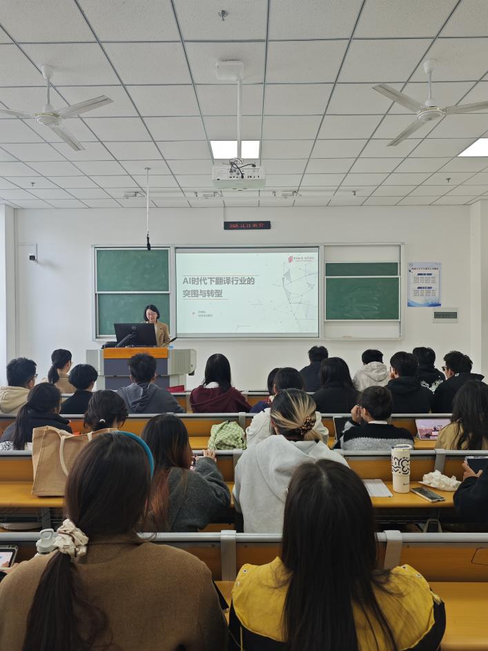 11月11日上午,日漫 商务英语专业开展“AI赋能与职业发展”主题活动,特邀译国译民集团洪细梅老师做“AI时代下翻译行业的突围和转型”专题讲座。商务英语专业全体学生参与此次活动,学院MTI研究生也共同参与学习。
