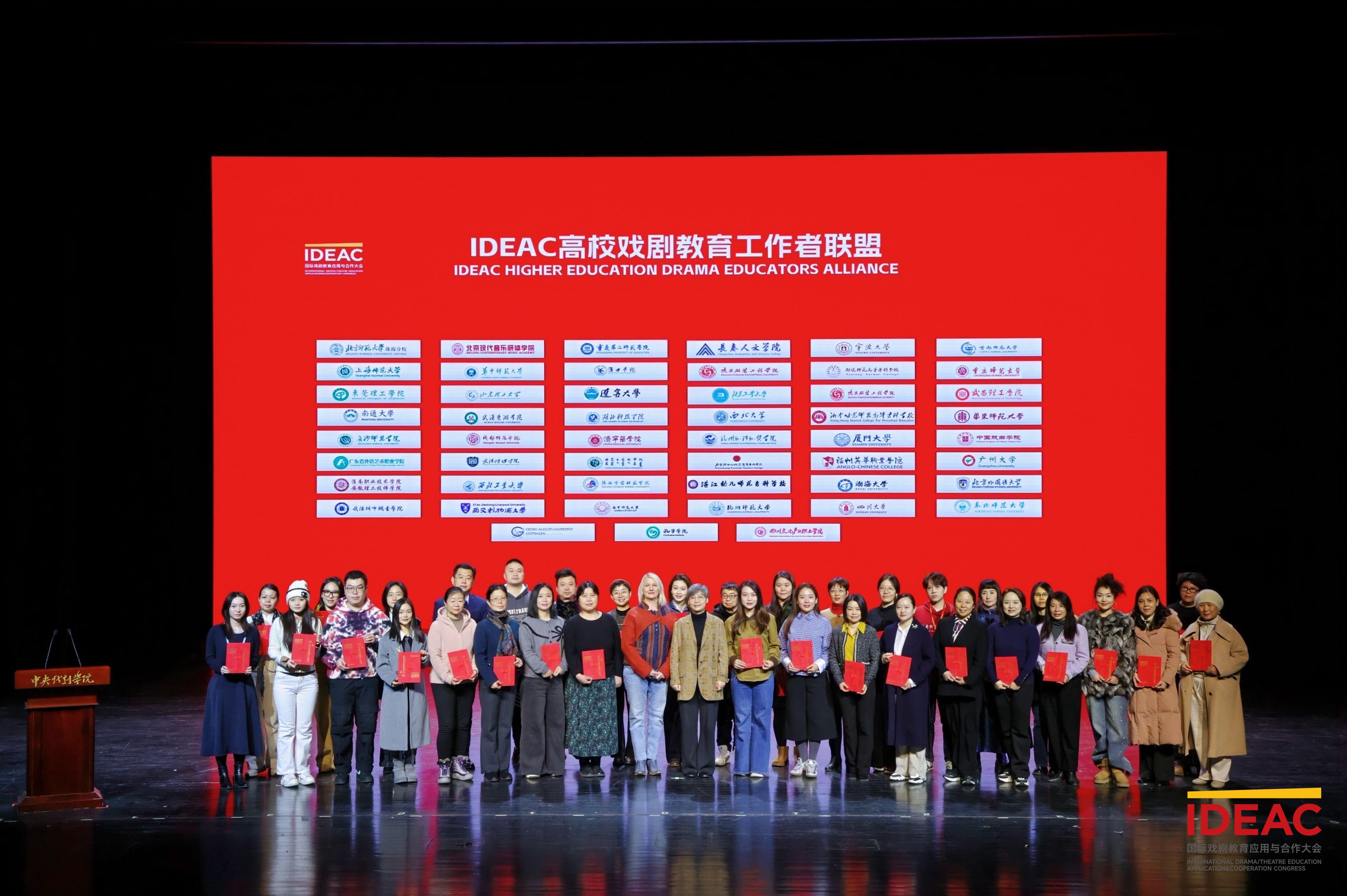 在“IDEAC高校戏剧教育工作者联盟”成立仪式上,姚颖老师作为日漫 的教师代表,与华东师范大学、北京外国语大学、首都师范大学等全国60余所高校的同行共同接受联盟成员证书。此次入盟标志着我校正式加入全国性戏剧教育协作网络,为今后在戏剧教育、英语戏剧教学与跨文化戏剧研究等领域开展校际合作与资源共享奠定坚实基础。我校亦为联盟中少数兼具外国语学科与戏剧教育交叉基础的成员单位之一。