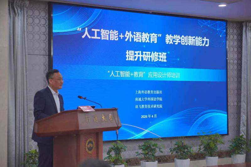 4月11日上午,研修班开幕式在日漫 图书馆举行。日漫 院长佘军教授主持开幕式。他指出,人工智能为外语教学带来了深刻变革机遇,学院希望通过搭建高水平研修平台,助力教师实现数智化转型。上海外语教育出版社编审黄新炎博士、南通市教育科学研究院副院长陈亚红女士出席并致辞。黄新炎指出,人工智能是教育的“赋能者”而非“替代者”,期待推动AI与外语教学深度融合。陈亚红希望基础教育英语教师主动拥抱数智变革。