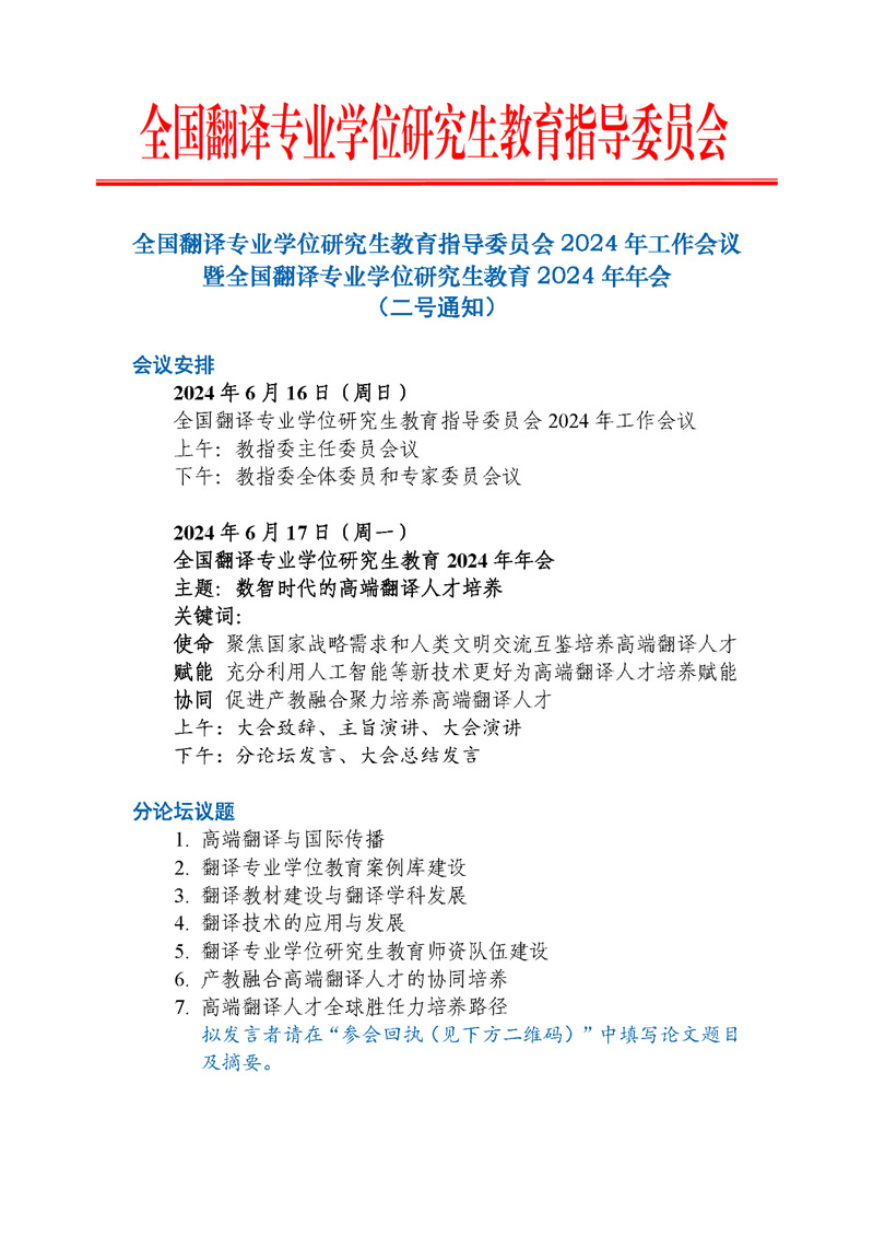 二号通知|全国翻译教指委2024年工作会议暨全国翻译专业学位研究生教育2024年年会